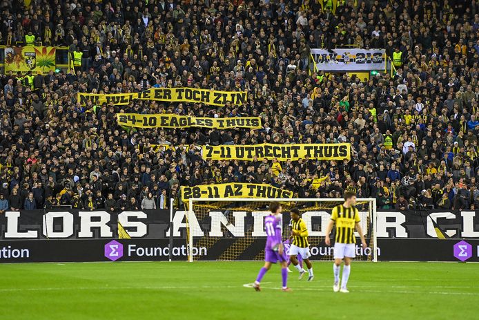 Zelfspot In Uitverkocht Gelredome Fanatieke Aanhang Richt Zich Met Spandoek Tot Andere Vitesse Fans Vitesse In Europa Gelderlander Nl